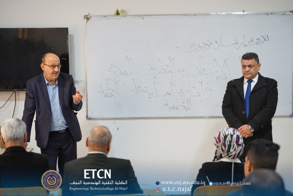 اقامت الكلية التقنية الهندسية النجف بجامعة الفرات الأوسط التقنية ورشة عمل حول الارهاب الفكري وآثاره السلبيه على العمليه التعليميه بالتعاون مع قسم هندسة تقنيات الاتصالات وشعبة الارشاد التربوي وشعبة المناهج الدراسية وقد تكونت الورشة التي حاضر فيها ا.م.د مؤيد باقر محمد و م.د حسام نعمان محمد علي التدريسين في الكلية حيث ناقشت الجلسة الابعاد السلبية على الصعيدين النفسي والمجتمعي على المجتمع الاكاديمي بشكل عام والمجتمع الطلابي بشكل خاص وناقش المجتمعون السبل الكفيلة التي من شأنها زيادة الوعي الطلابي وعدم الانجرار وراء الافكار المسمومة والعقائد المنبوذة التي تهدف الى تحطيم الاخلاقيات والادبيات والاعراف العامة السائدة. تعتبر هذه الورشه فرصه مهمه لتعزيز الوعي حول المخاطر المرتبطه بالارهاب الفكري وكيفية مواجهتها في السياق التعليمي .