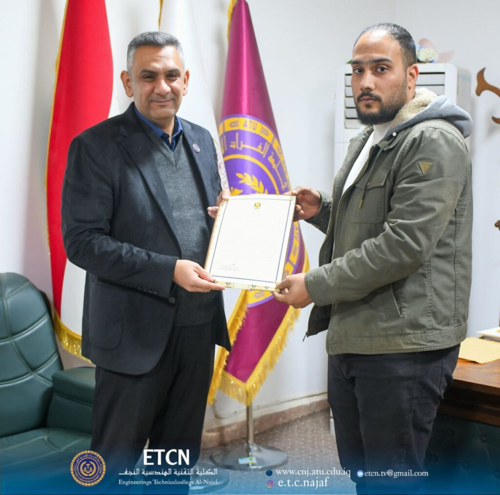 كرم السيد عميد الكلية التقنية الهندسية النجف احدى تشكيلات جامعة الفرات الاوسط التقنية الأستاذ الدكتور حسنين غني الحسيني الطالب محمد حسين حبيب من قسم هندسة تقنيات ميكانيك القوى الدراسة المسائيه بشهادة تقديريه من معالي وزير التعليم العالي والبحث العلمي تثميناً لجهوده المتميزه خلال سنوات الدراسة وحصوله على التسلسل الاول على طلبة الدراسة الصباحية والمسائيه . وقد بين السيد العميد ان الكلية تؤمن بتكريم الطلبة المتميزين في مسيرتهم العلمية . ايمانا منها بان التكريم يخلق حافزا للابداع على مختلف الأصعدة ويبث روح العطاء والانتماء للوطن والجامعة وان هذا الاحتفال يمثل خطوة مهمة في تشجيع الطلبة على التفوق الاكاديمي وتعزيز روح المنافسة الإيجابية بينهم متمنيا لهم الموفقية والنجاح خدمة لبلدنا العزيز .