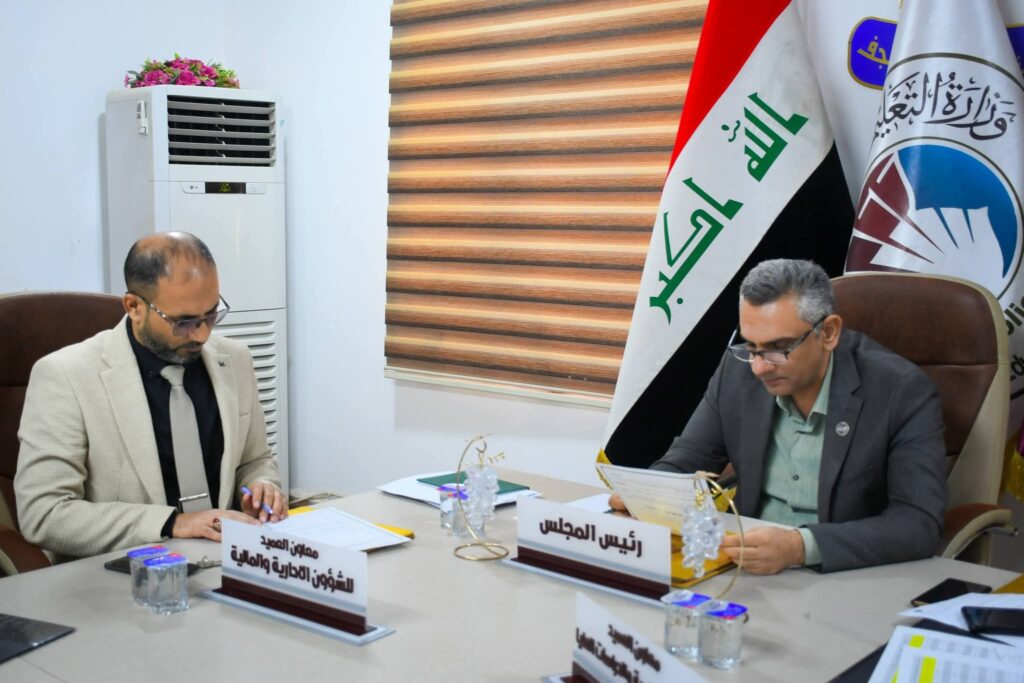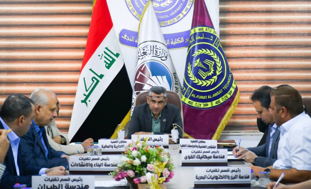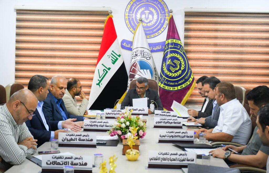 عقدت الكلية التقنية الهندسية النجف في جامعة الفرات الأوسط التقنية جلسة مجلس الكلية برئاسة السيد عميد الكلية الأستاذ الدكتور حسنين غني الحسيني، وبحضور السادة أعضاء مجلس الكلية، لمناقشة عدد من القضايا الأكاديمية والإدارية المهمة.