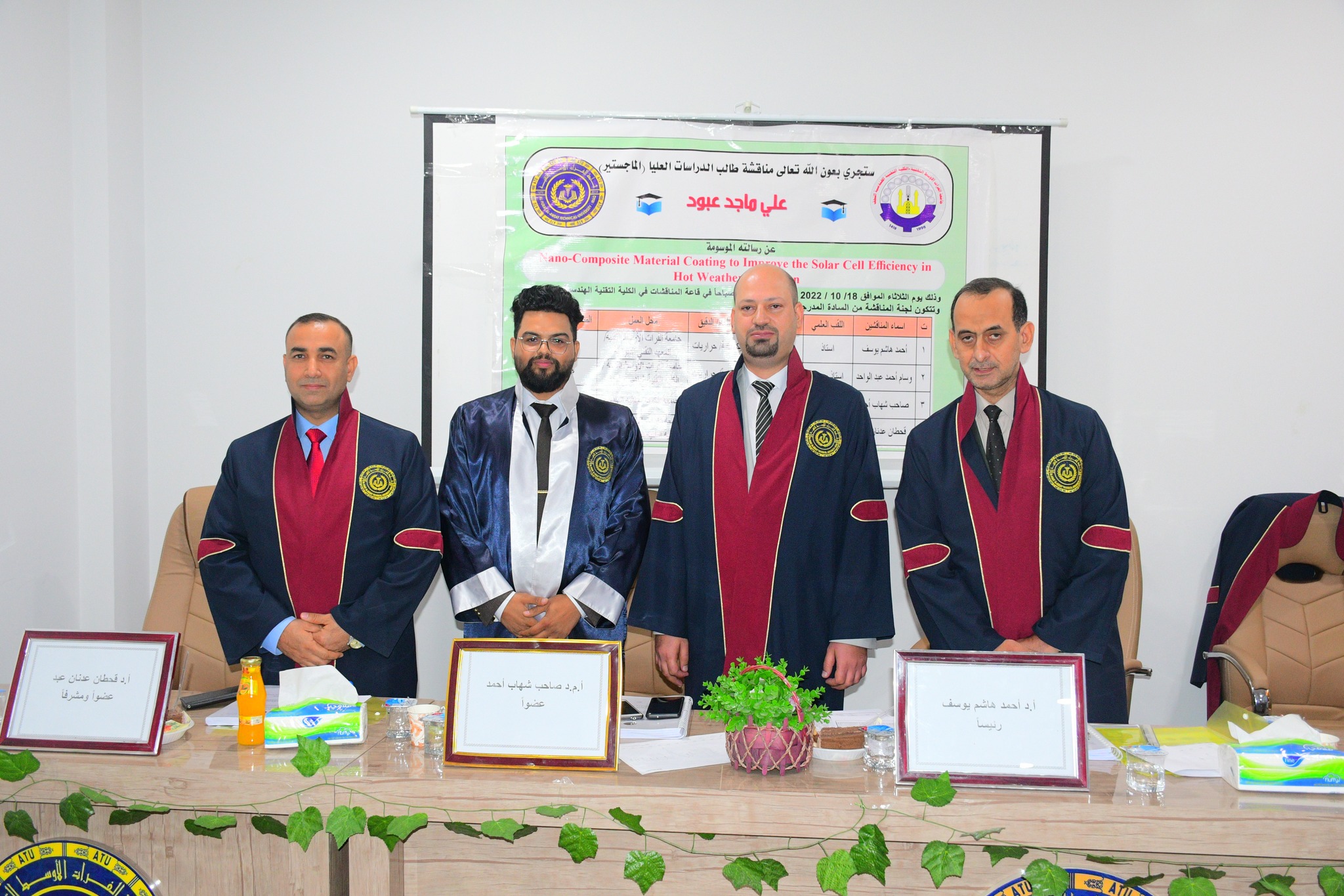 رسالة ماجسير لتحسين كفاءة الخلايا الشمسية في ظروف... ناقشت الكلية التقنية الهندسية النجف بجامعة الفرات الأوسط التقنية رسالة ماجستير بعنوان (طلاء مادة نانوي مركب لتحسين كفاءة الخلايا الشمسية في ظروف الطقس الحار) ل...