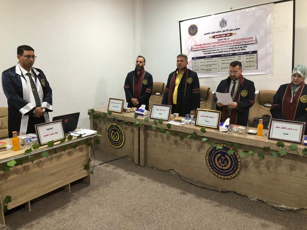 رسالة ماجستير عن دوائر راديوية عازلة للموجات الكهر... ناقشت الكلية التقنية الهندسية النجف بجامعة الفرات الأوسط التقنية رسالة ماجستير بعنوان(تصميم وتنفيذ دوائر راديوية ذات معامل انعكاس قدرة واطيء عازل للاشارات الكه...