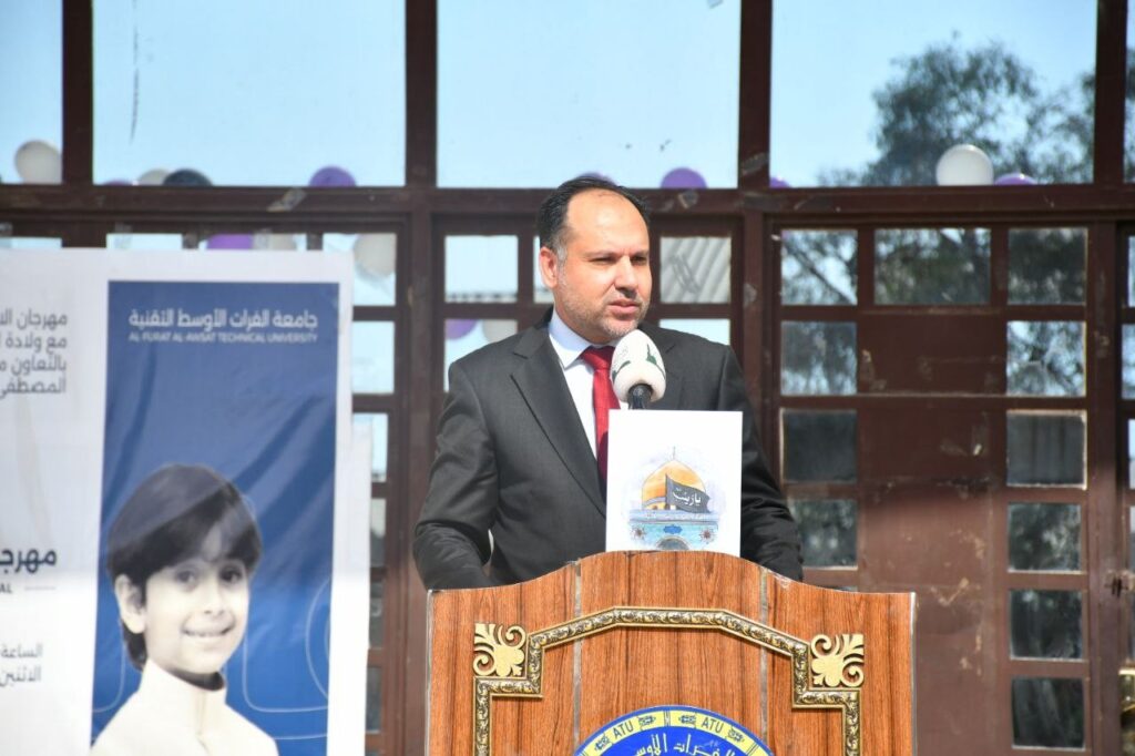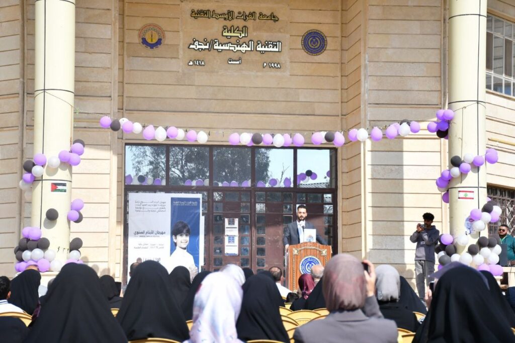 The festival was attended by the Vice President of the University for Scientific Affairs, Prof. Dr. Ahmed Ghanem Wadai, the Dean of the Technical Institute in Najaf, Prof. Dr. Haidar Hassan Al-Abdali, as well as senior staff members of the university and college, and a large gathering of faculty and students.