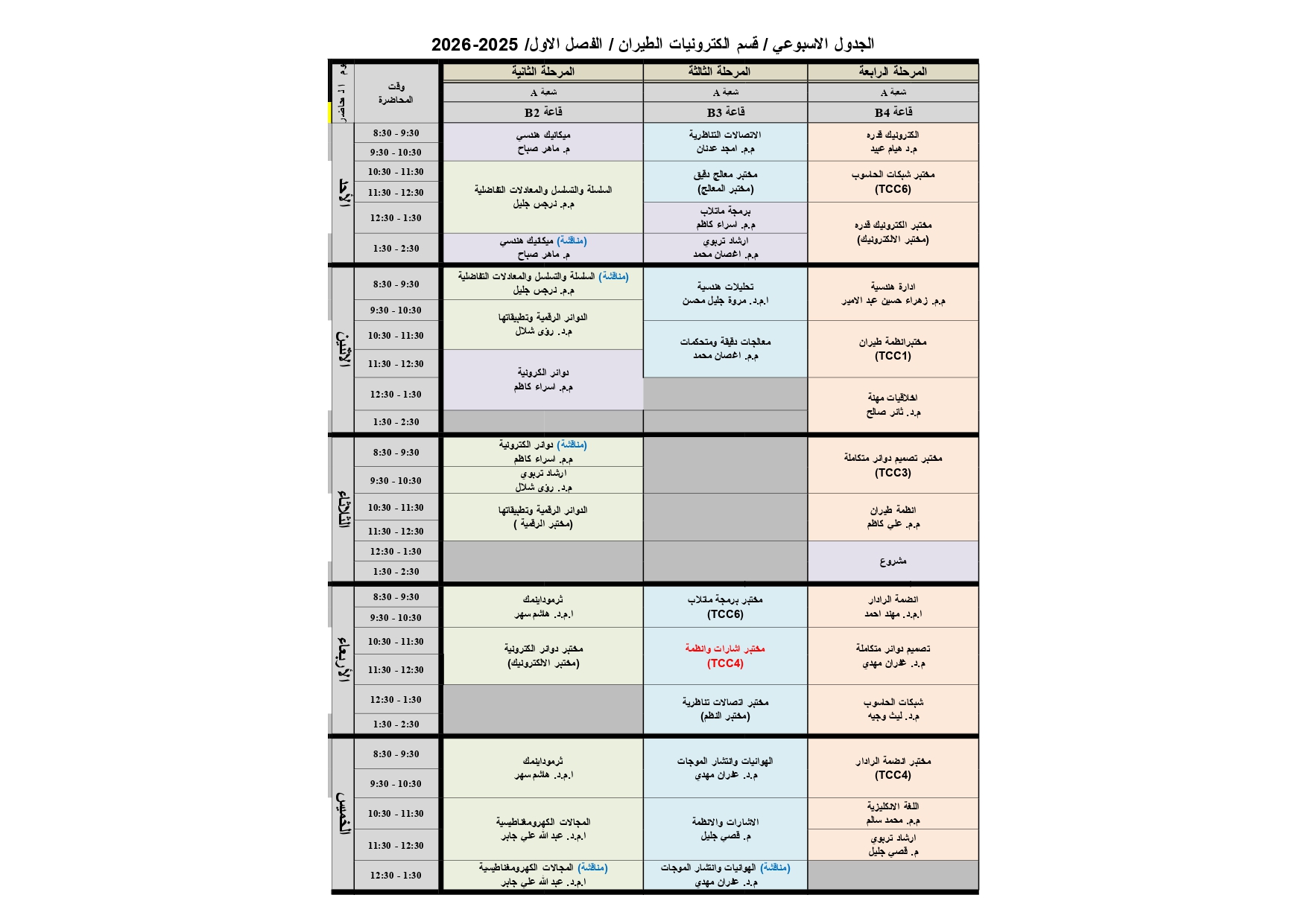 Read moreLecture and lab timings distributed across the study week for all levels in the Aviation Electronics Engineering Technologies Department.